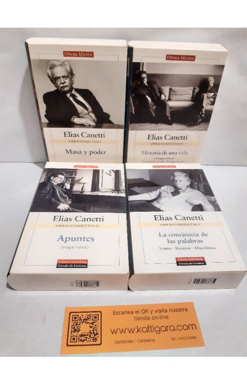 Tomo I: Masa y poder. Tomo II: Historia de una vida (La lengua salvada, la Antorcha al oído, El juego de ojos). Tomo IV: Apuntes 1942-1993. Tomo V: La conciencia de las palabras (teatro, ensayos, miscelánea). Buen estado de conservación, con cajas de cartulina. 3300 gramos. NO incluye el tomo III.